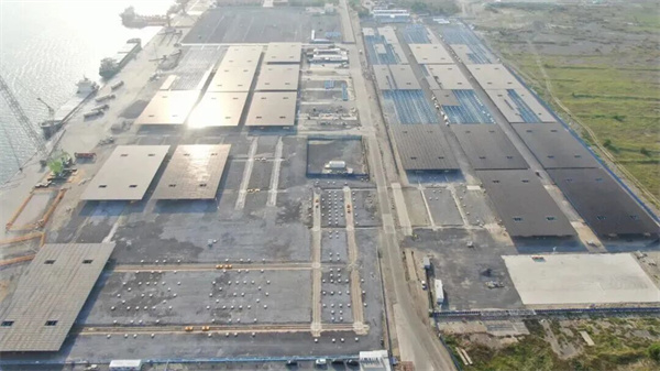 传统海上光伏项目,通常在同一个作业区内,相继完成网架拼装等多道工序,然后再装船出海。这种施工方式对场地面积需求大,施工效率低。该项目创新采用流水线作业方式:在海边设置6条产线、1条成品运输通道和1条备用运输通道,每条产线包括5个工位,分别负责网架拼装、主次檩安装等工序。每一步前置工序完成后,网架由程控轨道运输车运输至吊装位置,再由履带吊吊装到泊位,实现了从拼装到检测一条产线无回流。在流水线作业的施工模式下,项目最大限度节省码头资源,堆场用地节约10万平方米,施工和倒运效率提升50%。
