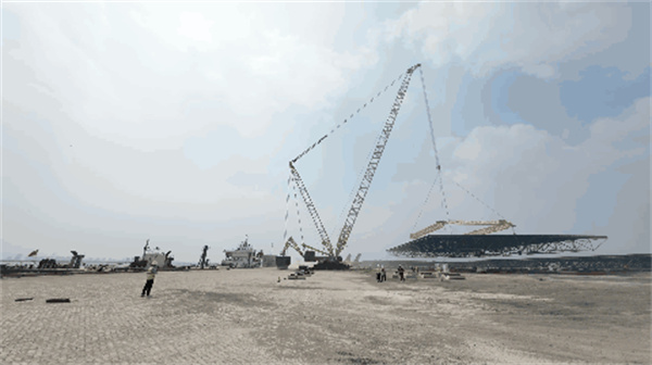 经历了流水线作业后,光伏网架单体来到倒运区域,等待被两台履带吊吊装上船。由于码头横风大,网架受力不均,容易在空中发生偏移,难以控制吊装精度。为此,项目团队为网架量身定制专属吊架,将网架形变和应力控制在比规范值小30%的范畴内。项目团队还组织进行了300余次模拟推演,最终将现场吊装精度误差控制在毫米级。