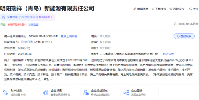 海洋能源网获悉,近日,明阳瑞祥(青岛)新能源有限责任公司成立,注册资本为500万元。新公司由明阳智慧能源集团股份公司100%持股。
