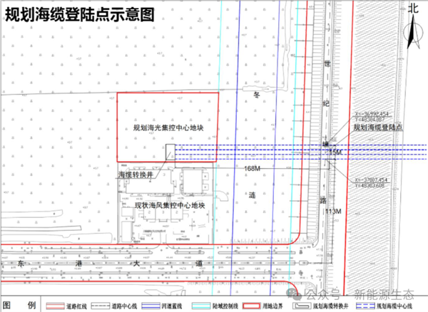 规划方案中,海缆转换井拟布置于选址地块内南侧;基于海缆转换井点位,海缆登陆点则位于选址地块的东侧,具体在世纪塘路(现状大堤)距离南侧东港大道约 113 米处。