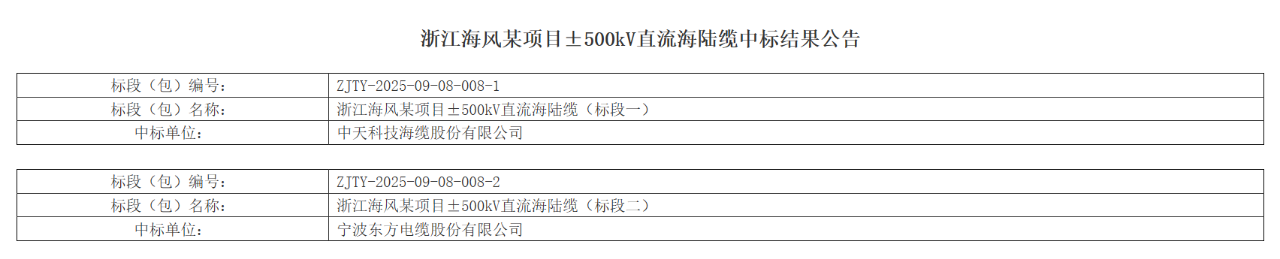 海洋能源网获悉,10 月 15 日,浙能集团智能供应链一体化平台发布了《浙江海风某项目 ±500kV 直流海陆缆中标结果公告》。公告显示,标段一的中标单位为中天科技海缆股份有限公司,标段二的中标单位为宁波东方电缆股份有限公司。资格预审公告显示,该项目的采购人为浙江海风新能源科技发展有限公司。