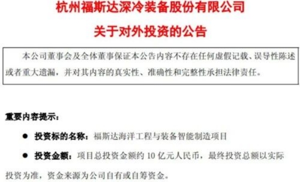 公告显示,为进一步延伸深冷技术应用场景,提升产业链附加值,打造具有国际竞争力的高端装备智能化工厂,福斯达于近日和启东市人民政府签署《投资协议书》,公司计划在启东吕四港经济开发区环抱式港池东港区投资“福斯达海洋工程与装备智能制造项目”。