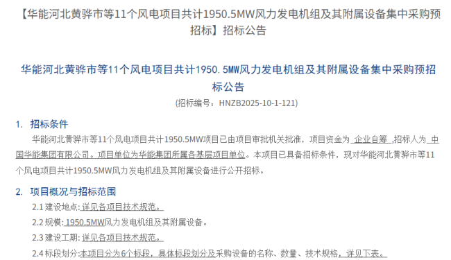海洋能源网获悉,10月20日,中国华能电子商务平台发布了《华能河北黄骅市等11个风电项目共计1950.5MW风力发电机组及其附属设备集中采购预招标公告》。其中,标段5和标段6分别涉及华能广东公司阳江三山岛一海上风电场项目和华能广东公司阳江三山岛二海上风电场项目,总装机容量达983MW。