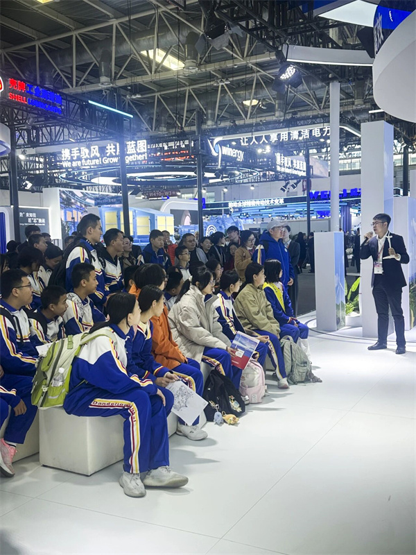 展会期间,中材叶片特邀蒲公英中学60名师生走进展台,举办了一场生动有趣的风电叶片科普活动。通过模型演示与互动体验,同学们直观了解了风电叶片捕捉风能并转化为电力的过程,认识了叶片的材料特性与制造工艺。活动以轻松有趣的方式传播绿色能源知识,展现了中材叶片在推动青少年科普教育方面的积极努力。