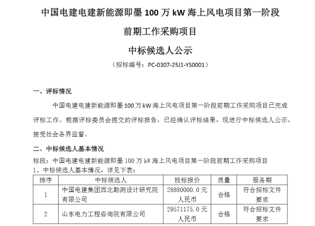 海洋能源网获悉,2025年10月24日,中国电建阳光采购网发布关于《中国电建电建新能源即墨100万kW海上风电项目第一阶段前期工作采购项目中标候选人公示》的公告。