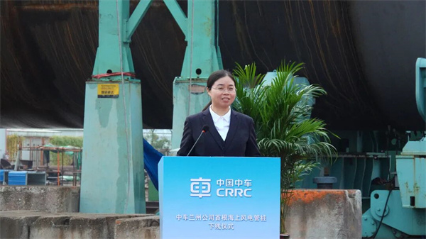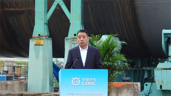 陈长春在致辞中表示, 中车兰州公司在风电塔筒制造技术管理、市场拓展均跻身全国行业前列。双方携手打造了良好的合作生态,累计合作项目52个。此次管桩下线,意味着中车兰州公司已形成塔筒、套笼与管桩的系列化制造能力,全面掌握了近海风电装备的核心生产技术。将进一步与中车兰州公司深化协同,充分发挥中车风电全产业链优势,共同实现“1+1>2”的聚合效应。