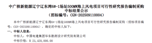 11月12日,中广核发布《中广核新能源辽宁辽东湾6#-1场址500MW海上风电项目可行性研究报告编制采购中标结果公示》。《公示》显示,辽宁辽东湾6#-1场址500MW海上风电项目可行性研究报告编制采购中标人为中国电建集团华东勘测设计研究院有限公司,中标价格为2542万元。
