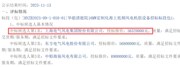 华能清能院16MW定制化海上低频风电机组设备招标中标候选人公示