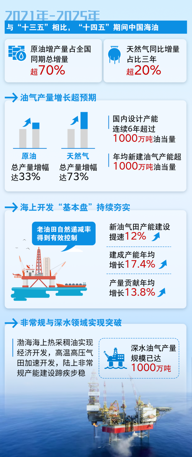 中国海油集团公司规划计划部有关同志表示:“与‘十三五’相比,‘十四五’期间公司油气产量迈上新台阶,原油增产量占全国同期总增量超70%,天然气同比增量占比三年超20%,在保障国家能源安全与提升能源自给率方面逐渐发挥主力军作用。”