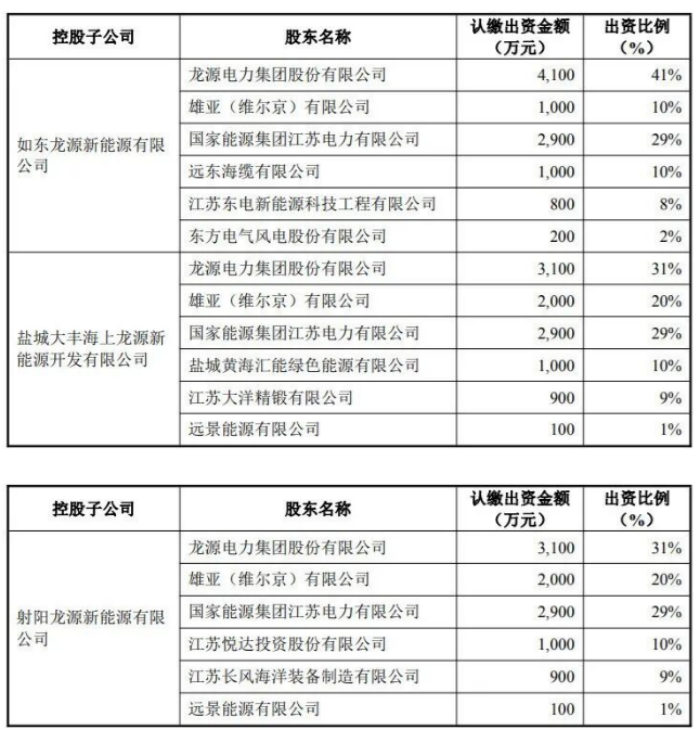 1. 如东龙源新能源有限公司:龙源电力出资0.41亿元占股41%,东方风电出资200万元占股2%,另有雄亚(维尔京)有限公司、国家能源集团江苏电力有限公司等4家公司共同参股,将用于开发江苏如东H16#15万千瓦风电项目。2. 射阳龙源新能源有限公司:龙源电力出资0.31亿元占股31%,远景能源出资100万元占股1%,其余股份由雄亚(维尔京)有限公司等4家公司持有,对应射阳海上南区H7#75万千瓦风电项目。3. 盐城大丰海上龙源新能源开发有限公司:股权结构与射阳龙源新能源有限公司一致,远景能源同样出资100万元占股1%,该公司将负责大丰H20#40万千瓦海上风电项目的开发建设和运营。