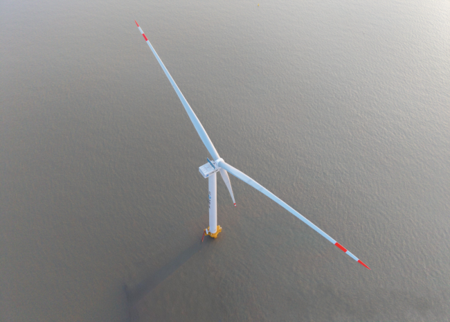 该 13.6 兆瓦的风力发电机组轮毂中心高度为 142 米,单支叶片长达 123 米,叶轮直径 252 米,扫风面积约为 5 万平方米,相当于 7 个标准足球场的面积。据测算,该机组每转一圈可产生约 29 千瓦时的清洁电能,每年可输出清洁电能超过 4650 万千瓦时,能够满足约 2.3 万户三口之家全年的生活用电需求。