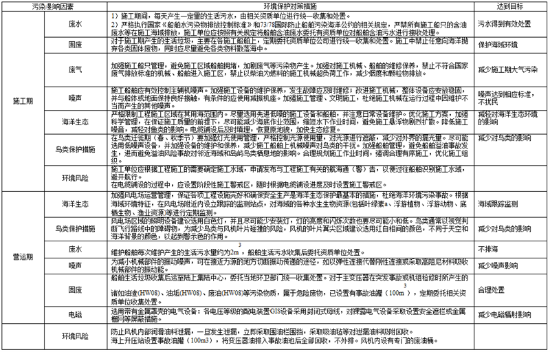 (6)电磁辐射:采用类比分析,海上升压站和海底电缆产生的工频电场强度和工频磁感应强度均能满足《电磁环境控制限值》的限值要求,对海洋生物影响较小。