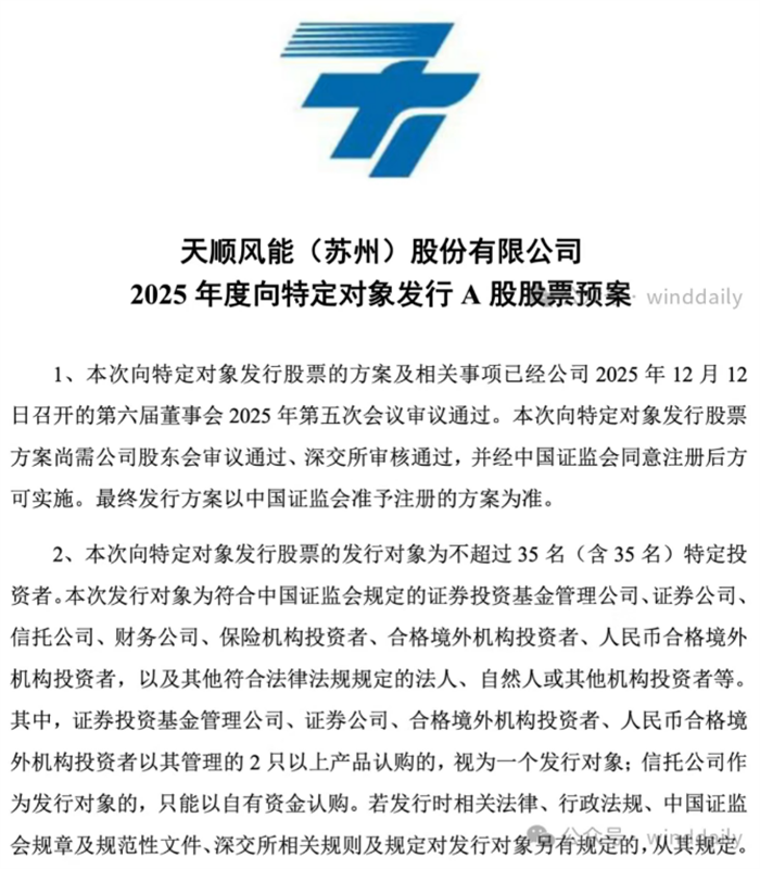 天顺风能董事会审议通过定增方案,拟向不超过35名特定投资者发行股票,募资总额不超过19.5亿元,