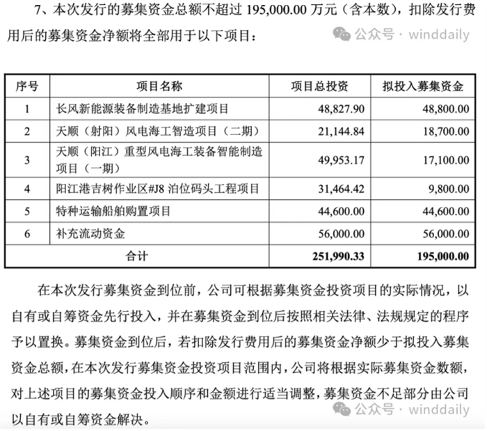 聚焦风电海工装备制造、运输及流动资金补充,推进“陆向海”战略转型。募资将重点投向五大实体项目:其中4.88亿元用于长风新能源装备制造基地扩建(服务欧洲等海外高端市场),1.87亿元投入射阳风电海工智造二期项目,1.71亿元用于阳江重型风电海工装备智能制造一期,9800万元建设阳江港专用重型泊位码头,4.46亿元购置2艘风电设备特种运输船舶,剩余5.6亿元补充流动资金。