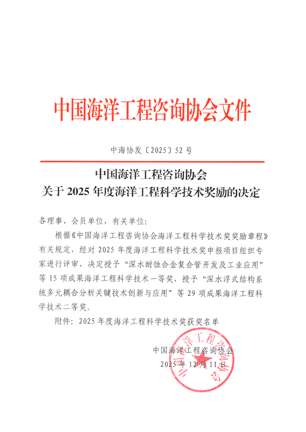 据悉,海洋工程科学技术奖由中国海洋工程咨询协会于2011年经科技部登记核准设立,主要奖励在海洋工程科学基础研究、技术开发应用、重大工程建设和社会公益等方面做出重要贡献的集体和个人,是我国海洋工程领域的权威奖项。本年度共授奖47个项目,其中一等奖15项、二等奖29项。
