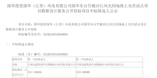 海洋能源网获悉,12月18日,国能 e 招发布关于《国华投资国华(江苏)风电有限公司国华东台竹根沙 Z1 风光同场海上光伏试点项目勘察设计服务公开招标中标候选人公示》的公告。