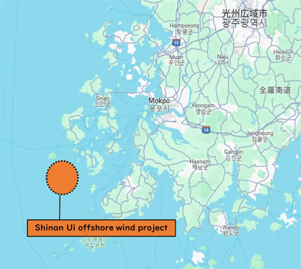 Shinan-Ui项目位于全罗南道(Jeollanam Province)海域,装机容量为390 MW,由Hanwha Ocean、SK Eternix、KOMIPO(韩国中部发电)、Future Energy Fund以及Hyundai E&C组成的联合体共同开发。