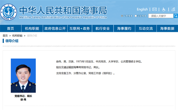 中国海事局官网显示:徐伟,男,汉族,1975年1月出生,中共党员,大学学历,公共管理硕士学位。
