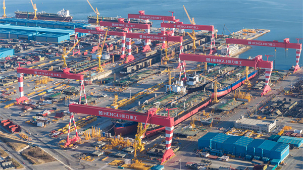 这是恒力重工世界级船舶建造能力的生动体现。 一艘船一个项目,四艘船四个工程,四艘巨轮同时具备出坞条件的复杂性和难度在行业罕见,严峻考验着恒力重工的建造能力和水平。