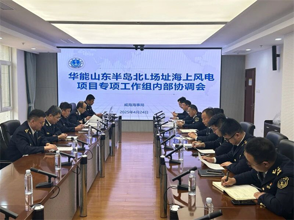 华能山东L场址海上风电项目位于山东半岛北部海域,装机容量504兆瓦,共安装42台单机12兆瓦风力发电机组,是国内首个水深超过50米的海上风电项目,也是山东省第一个深远海项目,有离岸距离远(距岸70公里)、自然条件差(水深、雾多、风大、浪急)、通航环境杂(临近三条主航路,商渔船流量大)、安全风险高(高峰期40艘施工船、600余人)、监管难度大(超出传统监管手段覆盖范围)等特点。为服务海上风电产业高质量发展,威海海事局坚持“1”个统筹、聚力“2”个协同、夯实“3”个基础、强化“6”个防范,全力助推海上风电建设提质增效。