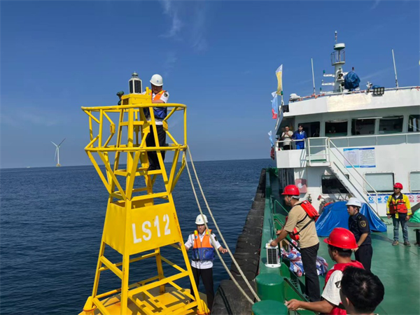 三是量体裁衣,提升主动防撞能力。联合航海院校、航保部门合理设计航标技术参数,加强无线电航标和远程遥测终端应用,风场外围布设16座灯浮标、5座AIS航标,同步在风电桩加装雷达应答器和声光信号,提升主动防撞能力。