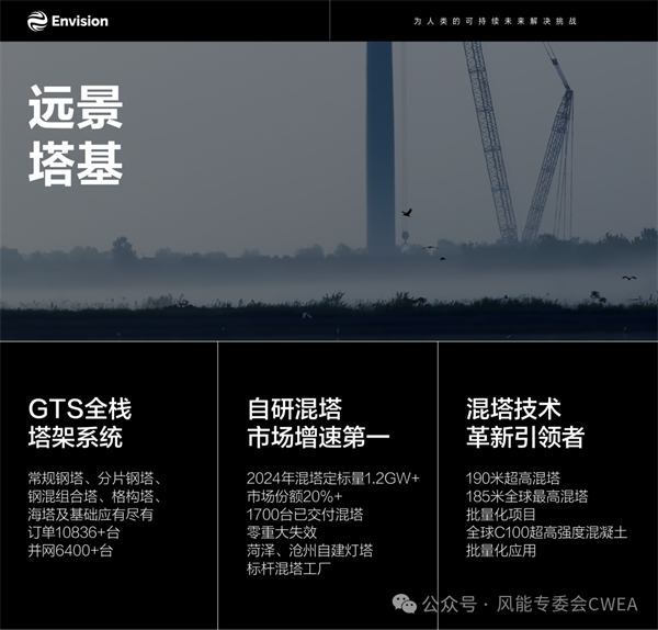 在混塔领域,2024年远景自研混塔定标量已超1.2GW,市场份额突破20%,实现市场增速第一,已交付的1700台混塔保持零重大失效。目前,远景在菏泽、沧州均自建 “灯塔工厂”,为混塔制造树立了行业标杆,形成了高效、智能、可复制的生产模式。作为混塔技术革新的引领者,远景成功打造了全球最高的190米混塔,并实现185米混塔的批量化交付;率先在全球范围内实现C100超高强度混凝土的批量化应用,不仅突破了材料和工艺的极限,也显著提升了塔架的结构性能和寿命。