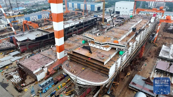 在位于山东烟台的中集来福士集团龙口建造基地建造的大型现代化滚装船(8月13日摄,无人机照片)。新华社记者 李紫恒 摄