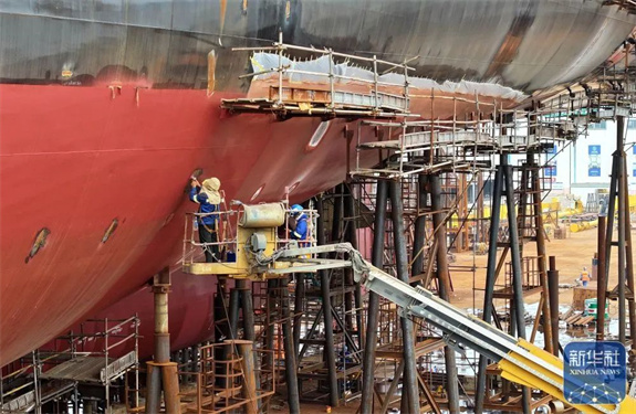 在位于山东烟台的中集来福士集团龙口建造基地,工人在进行打磨作业(8月13日摄)。新华社记者 李紫恒 摄